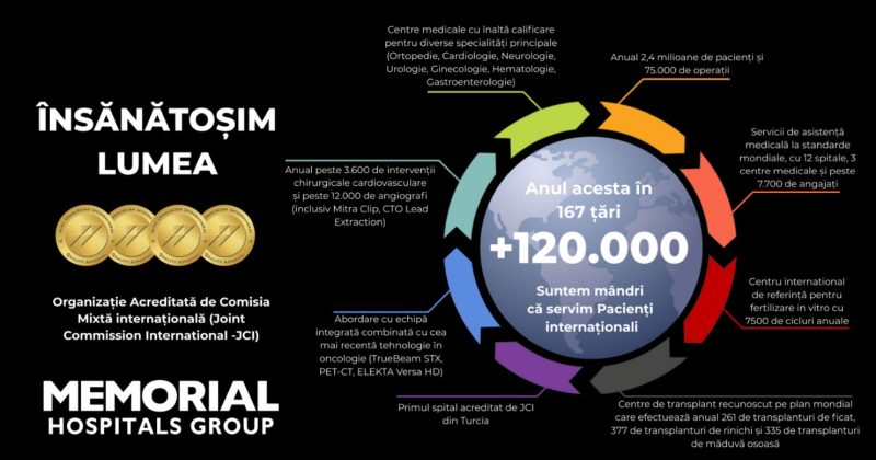 Despre Memorial Hospitals Group: Un spital global care aduce viitorul in prezent Memorial Hospital Group a fost primul spital din Turcia care a obtinut acreditarea JCI (Joint Commission International), considerata etalonul de aur in domeniul asistentei medicale. Cu o retea de 11 spitale (10 in Turcia si unul in Romania) tehnologizate si orientate spre nevoile pacientilor, alaturi de 2 centre medicale si 1 centru de wellness, Memorial Hospitals Group opereaza in 5 orase din Turcia, oferind anual servicii de sanatate pentru 120.000 de pacienti internationali proveniti din peste 167 de tari. Performante notabile in cardiologie: anual, echipa Memorial realizeaza 3.600 de interventii chirurgicale cardiovasculare si 12.000 de angiografii, incluzand proceduri avansate precum TAVI, Mitra Clip si extractia CTO Lead. In centrele de transplant renumite la nivel global, specialistii Memorial realizeaza anual 261 de transplanturi de ficat, 377 de rinichi si 335 de maduva osoasa. Ratele de succes in transplanturile de rinichi si ficat sunt de 99%, respectiv 93,5%. La nivel de grup, vorbim despre volume anuale impresionante: 2,4 milioane de pacienti tratati si 75.000 de interventii chirurgicale efectuate. Memorial Hospitals Group adopta noile tehnologii cu rapiditate, pentru a dubla pregatirea extraordinara a personalului medical, ghidat de principii etice solide si respectand standardele internationale de calitate.